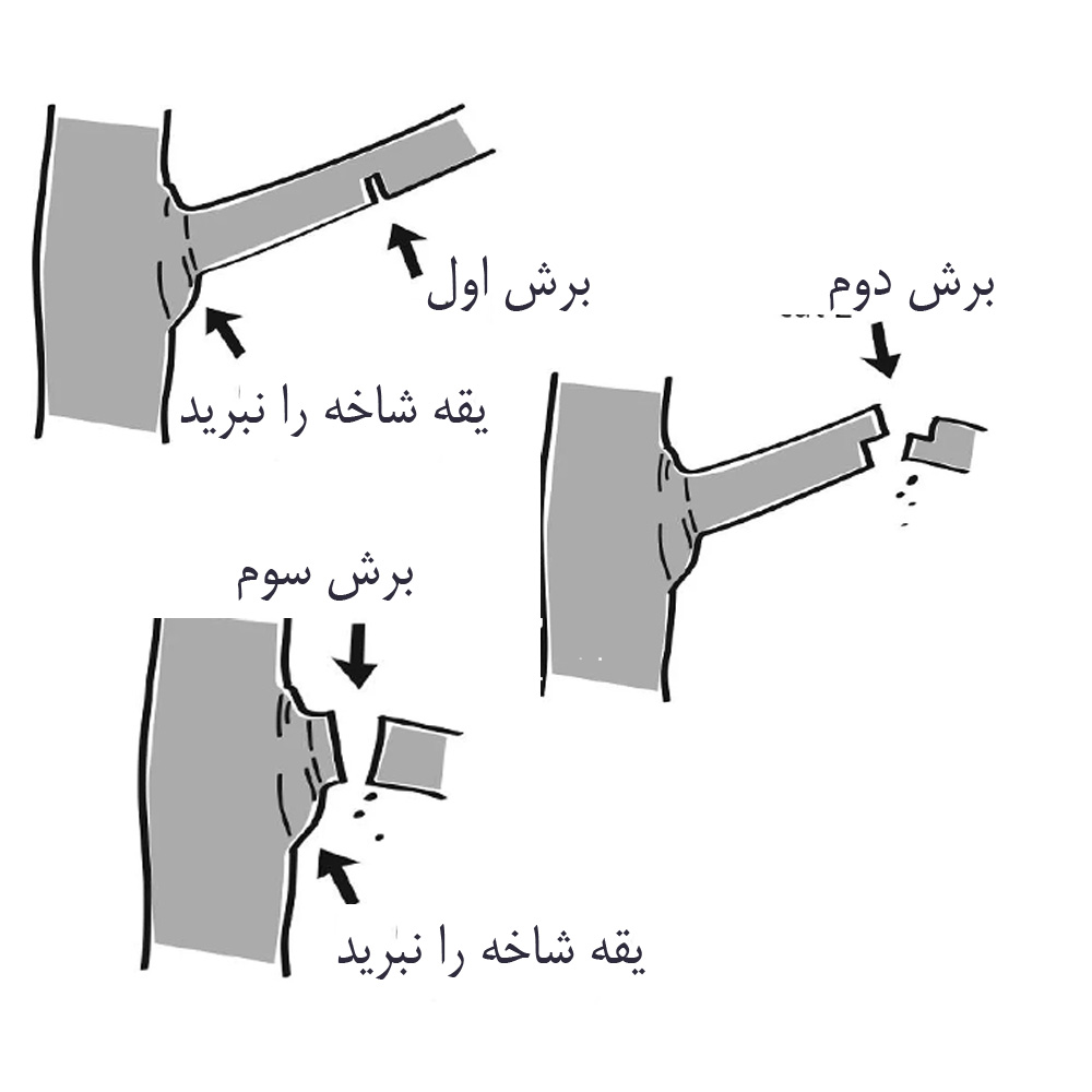- نحوه اجرا:کمی بیرونتر از برش زیرین (حدود ۵–۸ سانتیمتر)، برشی از بالا به پایین بزنید تا شاخه جدا شود. به محض رسیدن تیغه به نزدیکی برش زیرین، بخش بیرونی شاخه سقوط میکند.