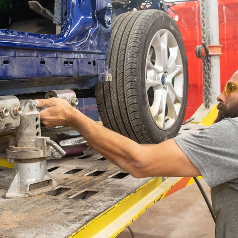- مهار کامل خودرو:خودرو روی میز صافکاری با گیرههای مخصوص ثابت میشود تا در طول عملیات تکان نخورد.