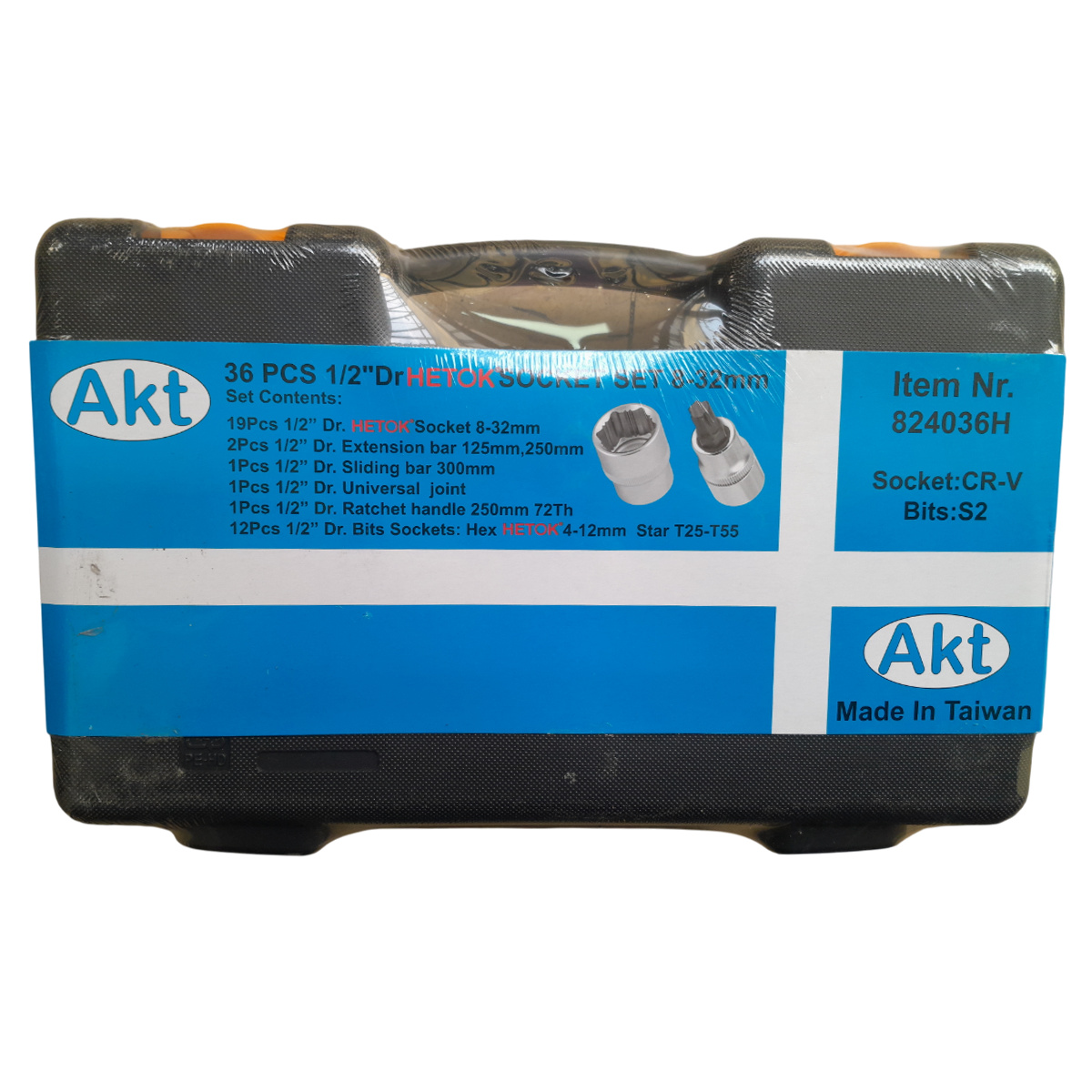 جعبه بکس 6 گوش HETOK برند AKT مدل 824036 گزینهای ایدهآل برای تعمیرات خودرو، صنایع مکانیکی، تأسیسات، کارگاههای فنی و مصارف خانگی است. این مجموعه کامل به کاربران امکان باز و بسته کردن انواع پیچ و مهرههای استاندارد، آلنی و ستارهای را با سهولت و دقت بالا میدهد.
