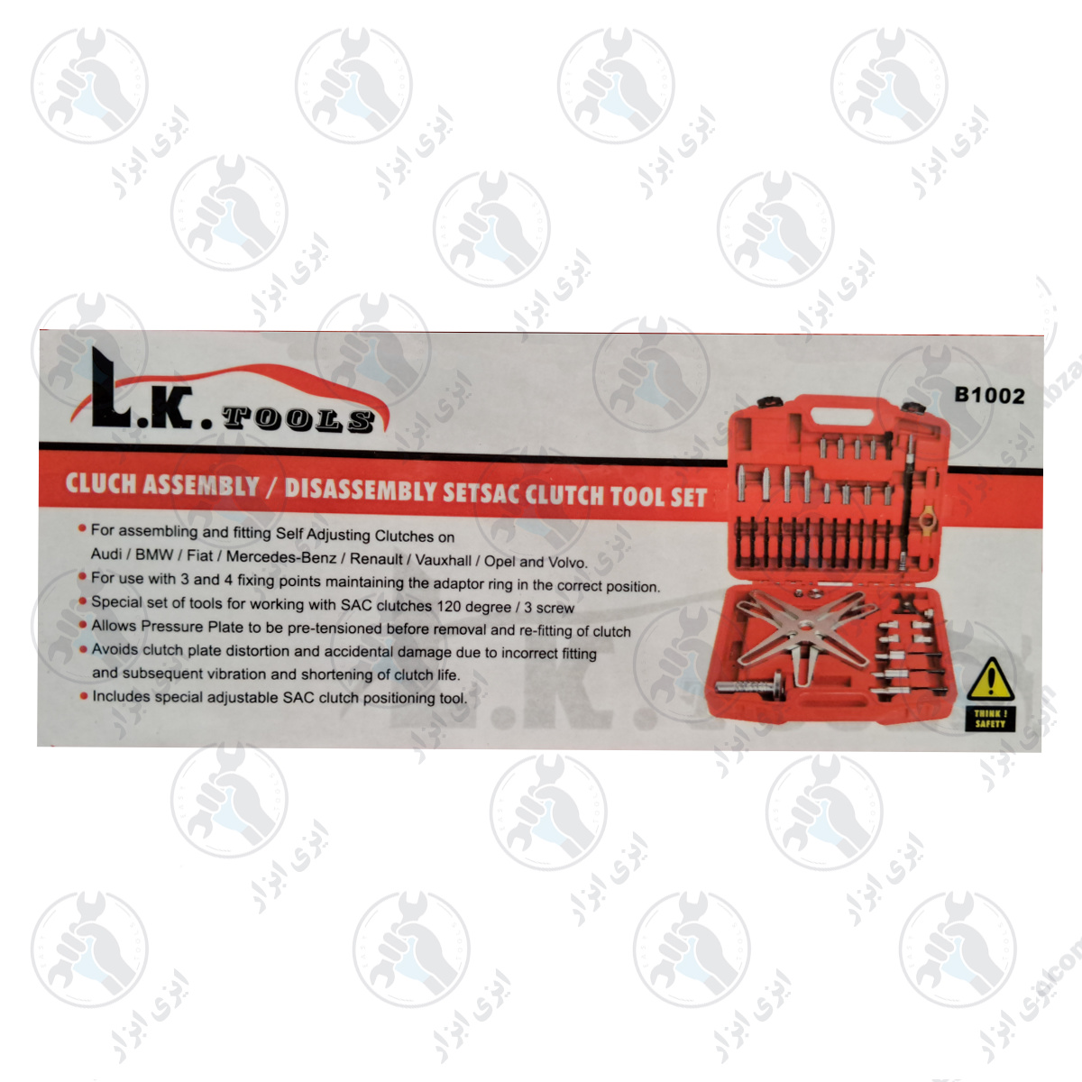 کیت باز و بست دیسک و صفحه کلاچ LK مدل B1002 یک ابزار حرفهای برای مونتاژ و نصب کلاچهای خودتنظیم است که برای خودروهای آئودی، بیامو، فیات، مرسدس بنز، رنو، واکسهال، اوپل و ولوو مناسب میباشد.